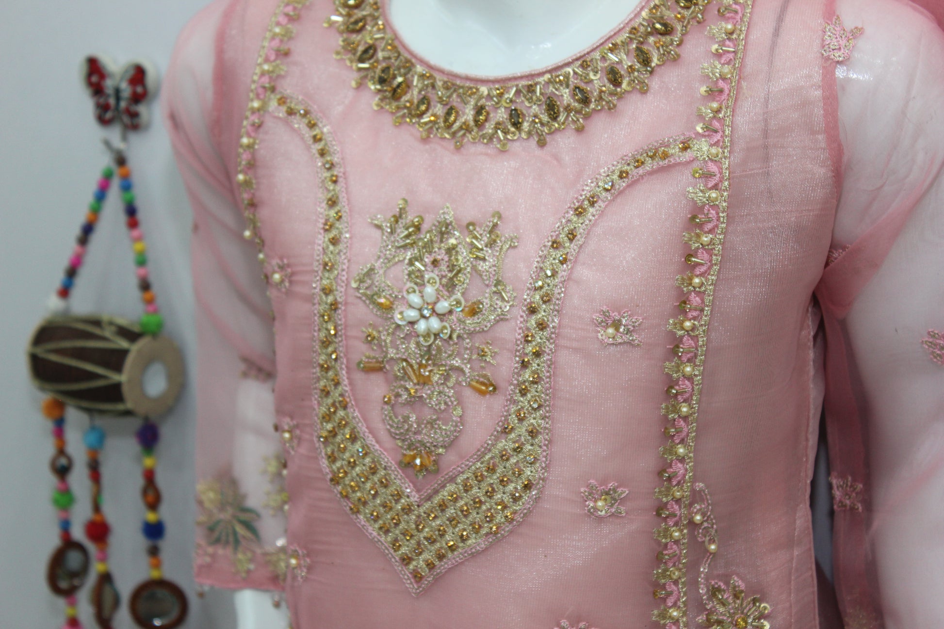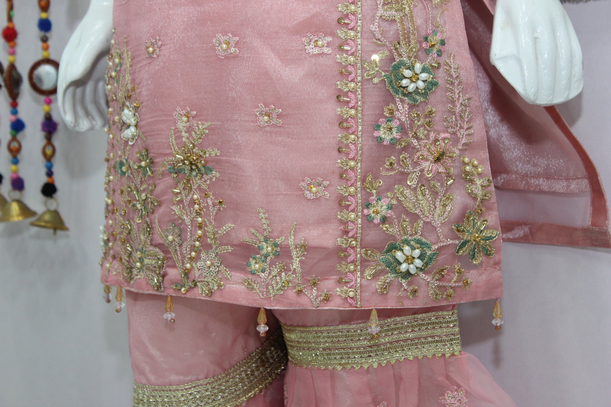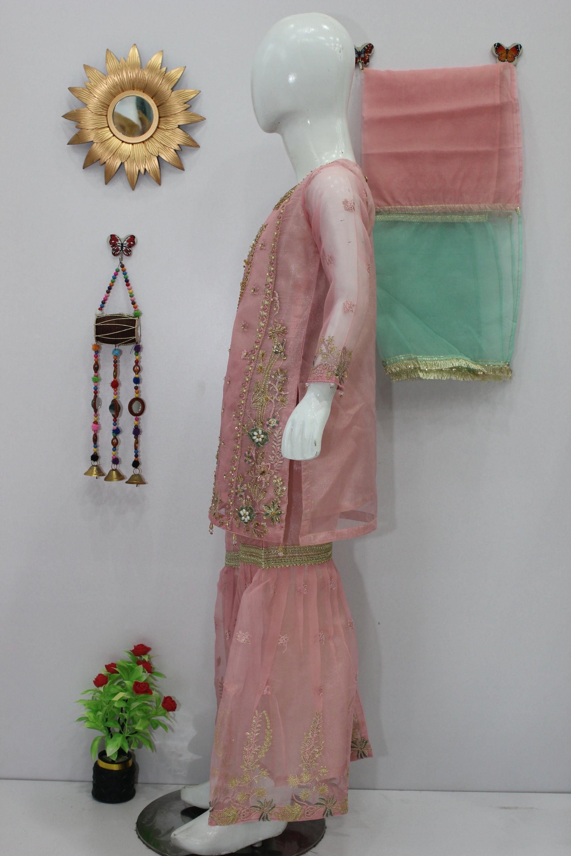 [2:06 am, 20/08/2025] IqRafiq Jazz: Make your little one shine in this beautiful Pakistani girls traditional embroidered dress, perfect for weddings, Eid, parties, and other special occasions. This elegant 3-piece outfit includes an embroidered organza shirt, gharara, and plain organza dupatta, making it the ideal festive wear.