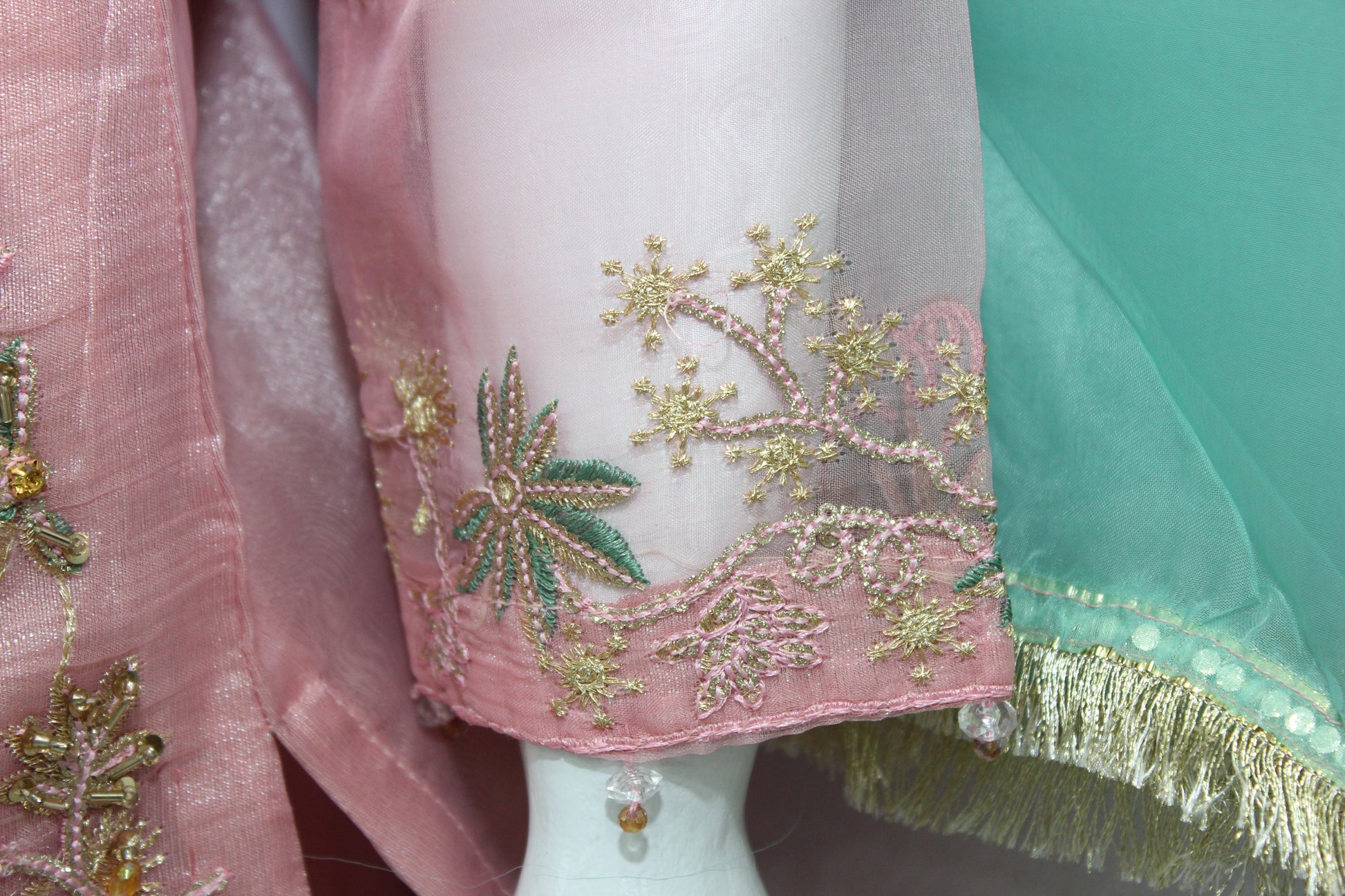 - 3 Piece Dress Set – Includes embroidered shirt, gharara (trouser), and organza dupatta